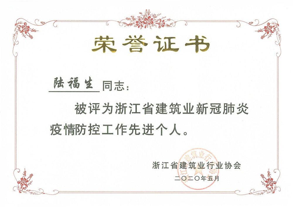 6月5日,浙江省建筑行業(yè)協(xié)會(huì)五屆三次理事會(huì)暨五屆四次常務(wù)理事會(huì)在杭州召開。會(huì)上公布和表彰了浙江省建筑業(yè)新冠肺炎疫情防控工作先進(jìn)單位和先進(jìn)個(gè)人。浙江嘉興福達(dá)建設(shè)股份有限公司被評(píng)為“浙江省建筑業(yè)新冠肺炎疫情防控工作先進(jìn)單位”,董事長(zhǎng)陸福生被評(píng)為“浙江省建筑業(yè)新冠肺炎疫情防控工作先進(jìn)個(gè)人”。